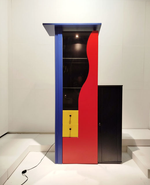 1980s German postmodern furniture, primarily defined by the Neues Deutsches Design (New German Design) movement, which was a radical, anti-functionalist departure from the established Bauhaus tradition, embracing bold, bizarre, and ironic furniture and objects movement, featured a raw, energetic aesthetic, often incorporating low-cost materials with very strong geometric forms and elements influenced by the Italian Design.